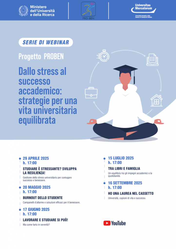 Una serie di webinar dedicata agli studenti universitari per affrontare lo studio, il lavoro e la vita personale con maggiore equilibrio. Attraverso strumenti di gestione dello stress, sviluppo della resilienza e prevenzione del burnout, il percorso accompagna i partecipanti verso un’esperienza accademica più sostenibile, favorendo benessere, motivazione e successo personale.