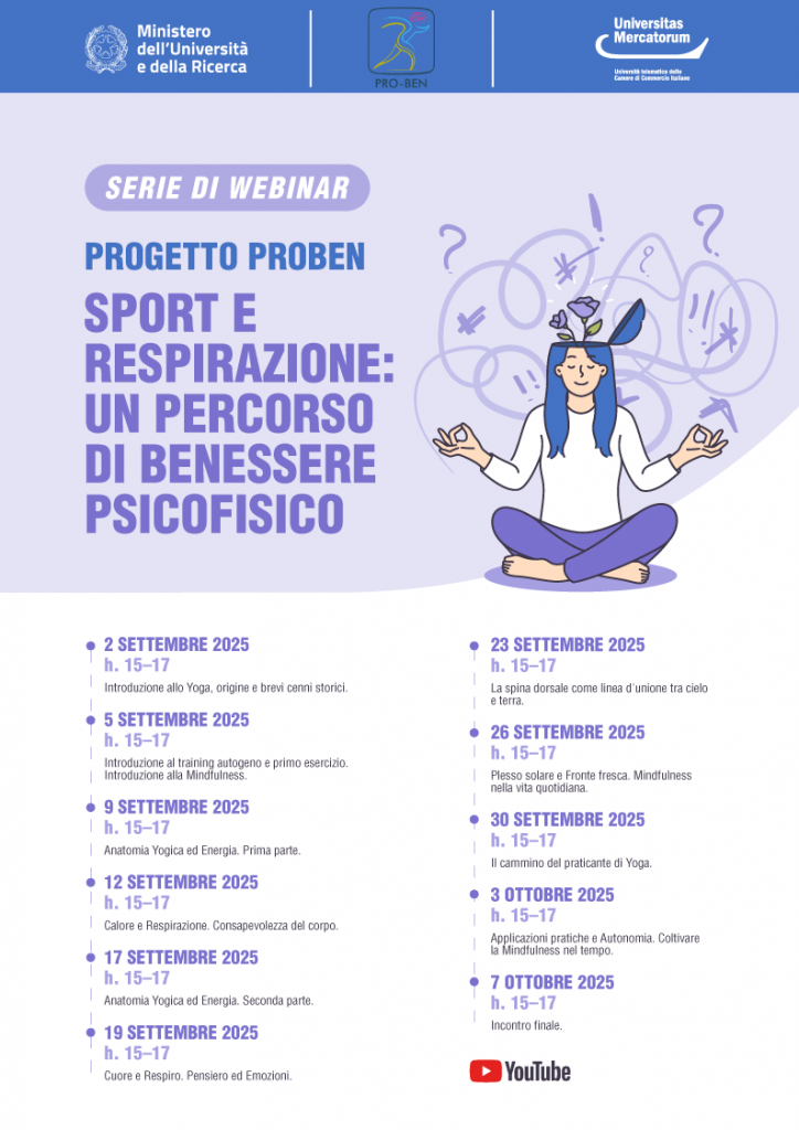 Una serie di webinar dedicati al benessere psicofisico che unisce pratica sportiva, respirazione consapevole e mindfulness. Attraverso un percorso progressivo, i partecipanti saranno guidati alla scoperta dello yoga, dell’energia del corpo e delle connessioni tra respiro, emozioni e pensiero, per sviluppare equilibrio, autonomia e benessere nella vita quotidiana.